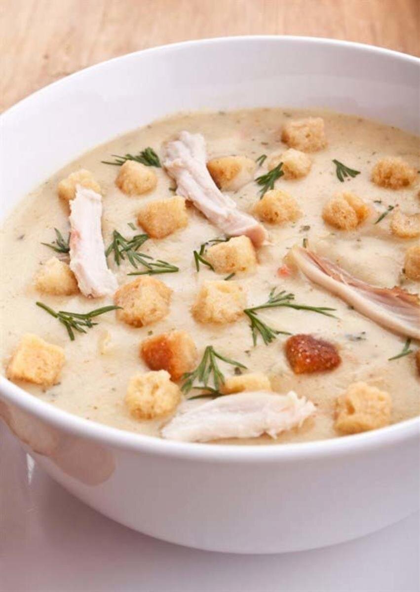 Ингредиенты: • курица - 800 г; • репчатый лук - 1 шт .; • морковь - 1 шт. ; • мука - 3 ст. ложки; • зелень петрушки и укропа - по 1 пучку; • черный молотый перец, шафран, соль . Приготовление: Курицу, лук и морковь сложить в кастрюлю, залить водой и варить 1 ч. За 10 мин. до окончания варки бульона положить пучки свежей зелени. Когда бульон будет готов, курицу вынуть на отдельную тарелку, жидкость процедить. На растительном масле спассеровать муку. В сковородку с мукой влить два половника готового бульона и прокипятить. Сваренные лук, морковь и спассерованную муку перемолоть блендером или пропустить два раза через мясорубку. Полученную массу протереть через мелкое сито в бульон. Мясо курицы пропустить два раза через мясорубку или размельчить в блендере, выложить в подготовленный бульон и добавить специи. Помешивая, варить на слабом огне 5 мин. Внимательно следите, чтобы суп не кипел. Подавать блюдо с гренками.
