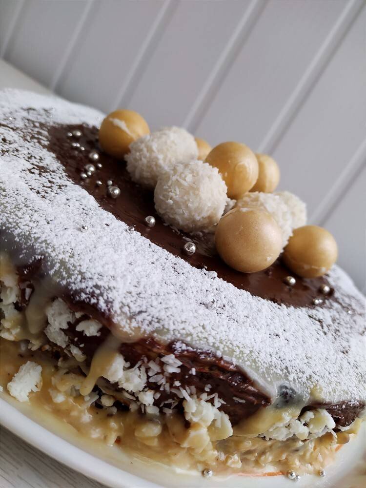 Ингредиенты: Бисквит:, яйца, сахара, муки, какао, меда, соды, Пропитка :, горячего молока, сгущенки, Начинка (крем):, 33% сливок, ванилин, желатина залить 60 гр.воды, Ганаш:, шоколада, 33% сливок Способ приготовления: Включить духовку и разогреть до 160°С. Мед, постоянно помешивая, нагреваем с содой до янтарной пены. Яйца взбить с сахаром до пышной пены и медленно ввести горячую медовую смесь, затем муку и какао. Аккуратно, но быстро лопаткой перемешать снизу вверх. Выпекать при 160°С 50 минут. Готовность проверить сухой спичкой. Остудить в приоткрытой духовке. Оставить бисквит на ночь в холодильнике. А утром разрезать на 3 части. Готовим пропитку: В горячем молоке развести сгущёнку и смазать каждый получившийся корж. Для крема желатин замачиваем в воде и оставляем для набухания. Затем нагреваем до полного его растворения, процеживаем и аккуратно добавляем во взбитые со сгущёнкой сливки. Не забудьте про ванилин:) Каждый корж пропитываем и заливаем кремом. Готовим ганаш. Шоколад растопи