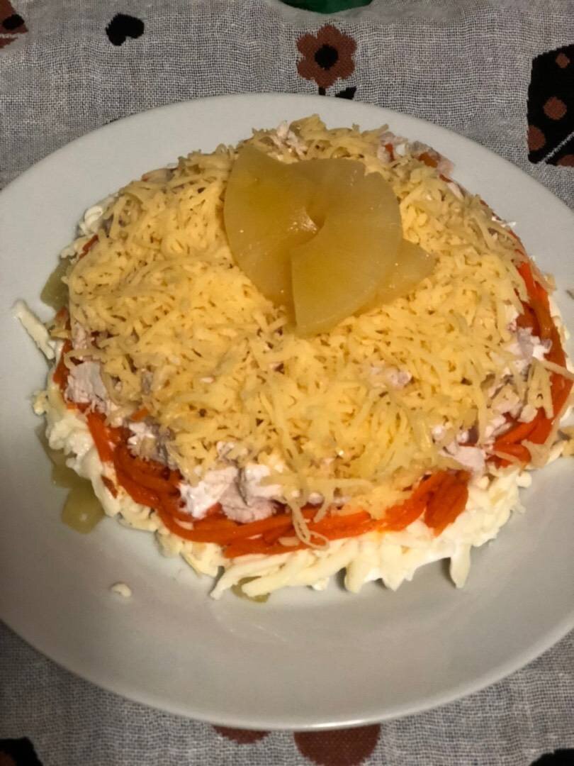 #меню #салатмедведь #салат # Вкусный, сочный, нежный салат для любого торжества или на каждый день👩🏽🍳 Очень легко и просто приготовить такой салат 😋 Ингредиенты: Грудка куриная отварная, Морковь по-корейски, Сыр твёрдый, Сыр плавленый «Дружба», Ананас консервированный, Майонез, Соль и перец Способ приготовления: Подготовить все ингредиенты. Филе отварить. Положить сыр натёртый, филе порезать, добавить в салатник. Помазать майонезом, добавить морковь, плавленый сыр натереть на тёрке. Ананас порезать, перевернуть тарелку или делать в форме, сверху посыпать сыром и подавать к столу 👩🏽🍳 Салат получился очень простым, лёгким и вкусным 🤍 Всем приятного аппетита 😋