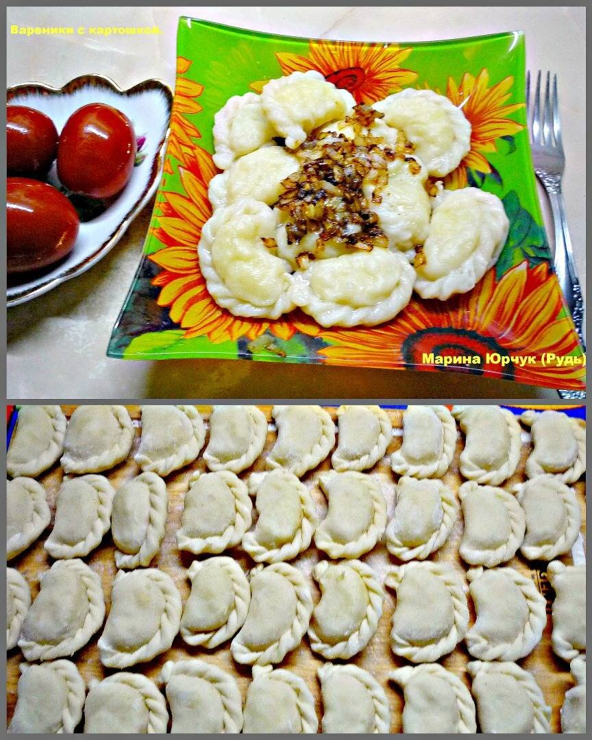 #пост Что может быть вкуснее домашних вареников! Начинка в варениках может быть разнообразной(картофель, капуста, грибы, творог и т.д.).Тесто также можно замесить на молоке, кефире, минеральной воде. То есть у каждой хозяйке свой секрет вкусных вареников. Предлагаю вам свой. Ингредиенты: Для теста: , – воды, – масло растительное, – соль, - мука, Для начинки: , - картофель, - соль и черный молотый перец, растительное масло, - репчатый лук Способ приготовления: Воду лучше брать теплую, добавить соль, масло. Хорошо перемешать и добавить муку. Муки сколько возьмет тесто. Оно должно получиться эластичным, не липнуть к рукам. Накрыть тесто и дать немного отдохнуть. Картофель очистить, отварить до готовности, посолить. Воду слить. Из вареной картошки делаем пюре. На растительном масле обжарить лук. Добавляем черный молотый перец и 1/2 обжаренного лука. Даем остыть. Тесто делим на порции. Раскатываем. Круглой формой или стаканом вырезаем кружочки. Выкладываем начинку. Лепим вареники с картошко