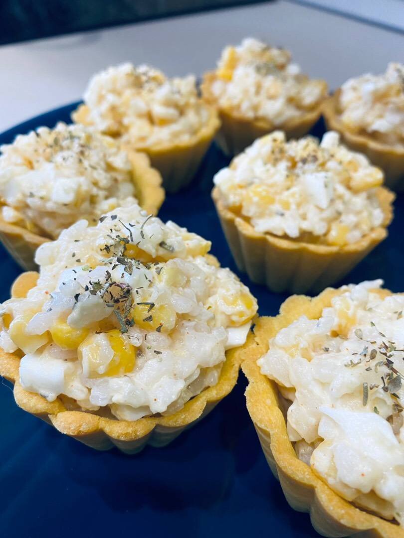 КБЖУ на 100 гр готового продукта 316/6/19/31 Вкусная закуска. Ингредиенты: Тесто, сливочное масло, кукурузная мука, яйцо, Соль , Начинка, рис (в сухом виде), консервированной кукурузы, яйца, майонез, Специи Способ приготовления: Для теста смешать все ингредиенты до однородности, тесто получается ровным и не липнет к рукам. В формочки сформировать тарталетки, сделать дырочки, чтобы при выпечки тесто не поднялось, выпекать при 180 градусов 15 минут. Для начинки отварить рис, остудить, яйца сварить вкрутую, смешать рис, яйца, кукурузу и майонез. Добавить специй по вкусу. Я добавила соль, прованские травы и паприку. В остывшие тарталетки положить начинку, приятного аппетита!