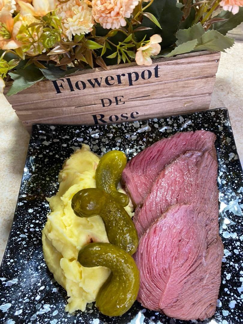 Ростбиф - это блюдо, где кусок большой говядины запекается в духовке при небольшой температуре, но долго. Получается,в зависимости от того какая температура внутри, разной степени прожарки. Если у вас есть кулинарный термометр, то, конечно, контролировать прожарку легче. Мне нравится вот такая прожарка : внутри мясо остается красно-розовым, и вытекает розоватый сок. Я использовала тазобедренный отруб говядины, или огузок, или вырезку можно тоже, то есть любую часть говядины которая подходит для запекания. С маринадом для говядины тоже можно по экспериментировать. Может быть его просто даже посолить, мясо и так очень вкусное. Ингредиенты: Говядина для запекания, целый кусок, Соевый соус, Растительное масло, Картофельное пюре, Корнишоны Способ приготовления: Говядину избавить от жилок, и замариновать соевом соусе на ночь. При этом если соевый соус не перекрывает полностью мясо, то через какое-то время переверните его. Смазать кусок говядины со всех сторон растительным маслом. Обжарить до