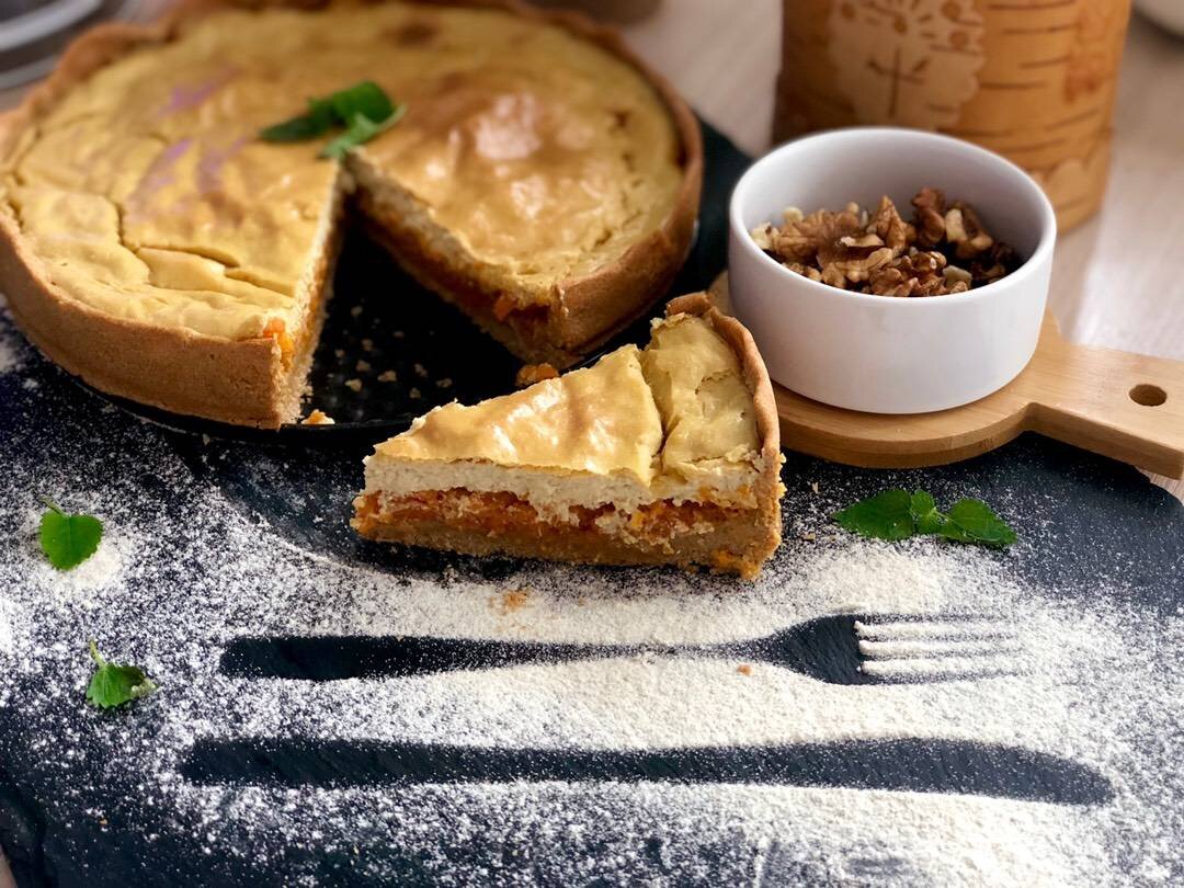 Рецепт появился случайно, когда я думала куда бы применить жмых моркови оставшийся после выдавливания сока. Так вот, случайно но не напрасно. Муж сказал, это самый вкусный пирог, который я ел)). Ингредиенты: Тесто, цельнозерновой пшеничной муки, крутого кипятка, растительное масло, соды, Начинка, морковь (среднего размера)или жмых, копченая паприка , чеснока, тофу копченый, кешью предварительно вымоченного в воде (или 3 ст.л урбеча кешью), неактивные дрожжи (для придания сырного аромата), чеснока Способ приготовления: Насыпать в миску муку добавить соду перемешать. Медленно вливать кипяток, помешивая деревянной ложкой. Когда тесто будет достаточно густое, добавить две ложки масла и вымесить эластичное тесто руками. Морковь натереть на мелкой тёрке. На сковороду добавить масло, выложить морковь обжаривать минут 7 постоянно помешивая. Добавить к моркови копчёную паприку и чеснок измельчённый, жарить ещё 5-7 минут. Тофу, кешью, неактивные дрожжи, чеснок положить в чащу блендера, добавить