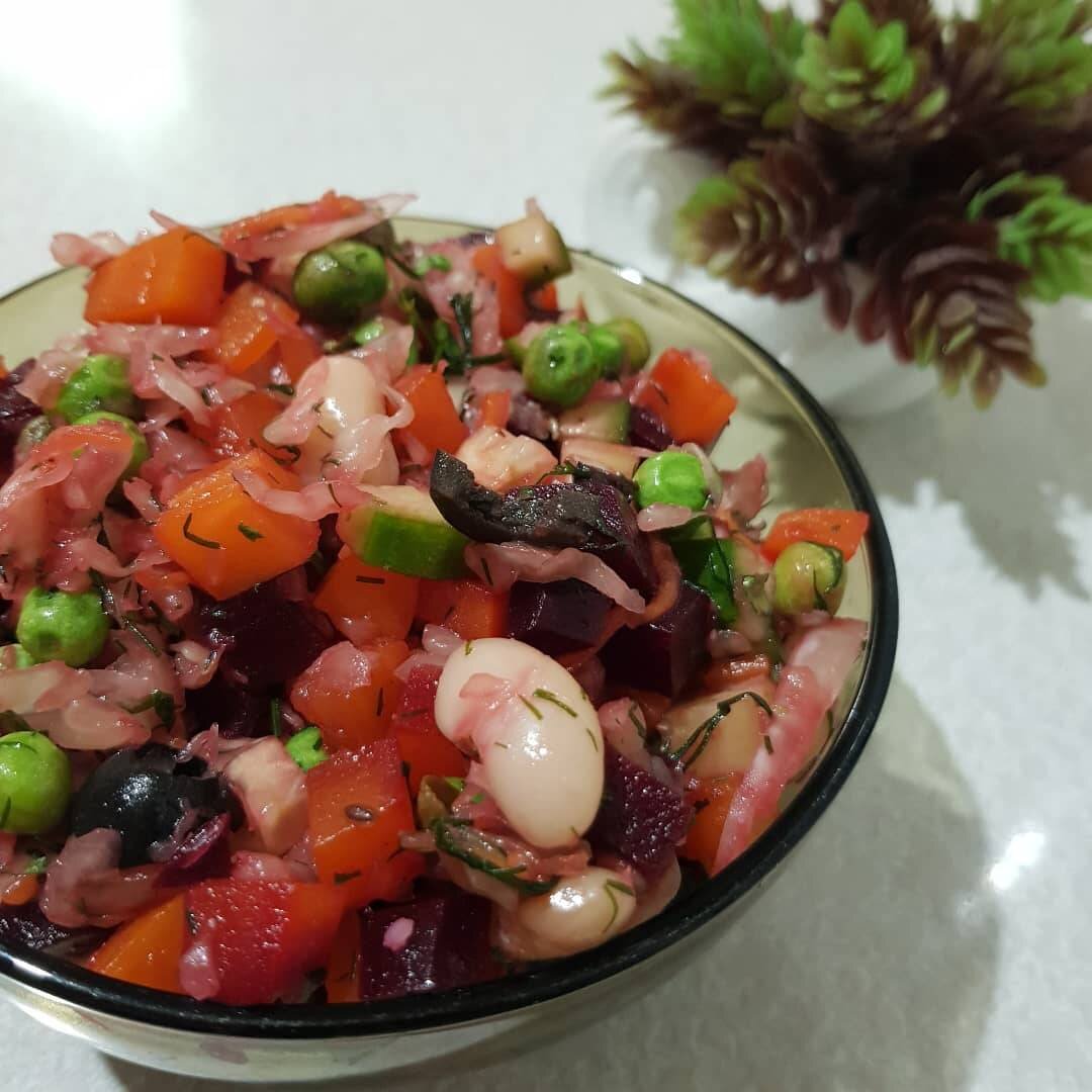 Сейчас в интернете полно рецептов винегрета, но я просто в восторге от этого. Готовлю только такой. Ингредиенты: Картофель, Свёкла средняя, Морковь средняя, Маслины мини без косточек, Зелёный горошек замороженный , Капуста квашеная , Каперсы, Свежий огурец средний, Масло горчичное , Укроп, Соль, Перец черный, Куркума Способ приготовления: Отвариваем картофель, морковь и свёклу. Нарезаем мелкими кубиками. Добавляем каперсы и маслины нарезаем колечками. Свежий огурец нарезаем кубиками, добавляем зелёный горошек и квашеную капусту. Добавляем соль, специи и масло. Перемешиваем. Приятного вам аппетита ❤️.