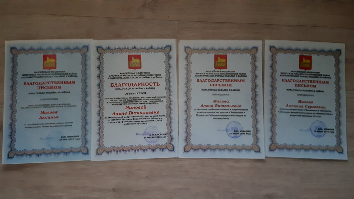 Мини-опрос: 1. В вашей семье много грамот и благодарностей? У нас их - море разливанное, и основная часть принадлежит моей дочери, которая благодаря себе имеет спортивные награды, и благодаря себе и маме - творческие. 2. В вашей семье много благодарностей от мэра города? У нас их целых 4: 2 - дочери, 2 - мои. Первую благодарность дочка получила, когда съездила в Москву на Первенство России и заняла там второе место. По возвращению в школе на линейке ей специалист по молодёжной политике и спорту вручила от мэра благодарственное письмо и мягкую игрушку - зайца. Второе благодарственное письмо от мэра она получила после поездки на Первенство Сибирского Федерального округа, которое проходило в Красноярске. У неё - второе письмо , у меня - первое. Мне его вручили тоже после этой поездки, я возила детей на эти соревнования. Торжественно на заседании городской Думы дочке и мне мэр вручил благодарственные письма и пакет со сладостями. Получилось у дочери - 2, у меня - 1. И вот вчера весы ура