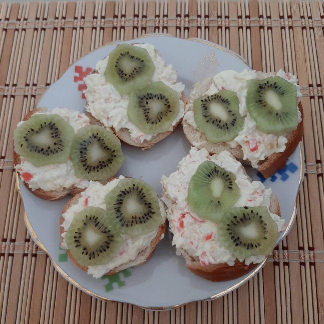 Бутерброды с намазкой из крабовых палочек, киви, чеснока и майонеза - прекрасный вариант закуски на скорую руку. Бутерброды получаются сытными и очень оригинальными, а добавление ломтиков киви придаёт бутербродам яркий вид, освежающий вкус и сочность. Быстро и вкусно! #рекомендую #меню #закуска #бутерброды Ингредиенты: крабовые палочки, твердого сыра, майонеза, киви, багет, чеснока Способ приготовления: Сыр потрите на мелкой терке. Мелко порежьте крабовые палочки. Смешайте сыр, крабовые палочки и чеснок. Заправьте майонезом и перемешайте. Киви очистите, порежьте пластинками. Намазать приготовленной пастой нарезанный багет. Сверху выложить ломтики киви. Приятного аппетита!!!!