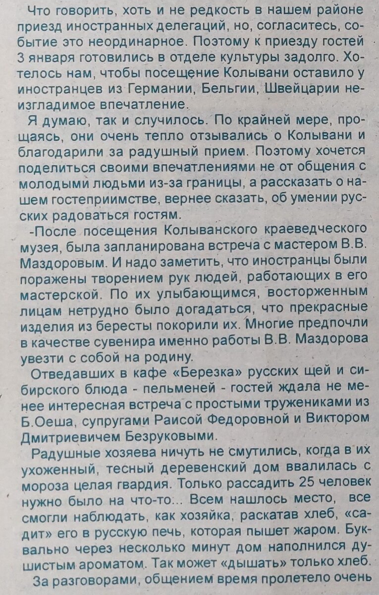 По поселку Колывань прогулялись. А расставаться с этими местами не хочется. Давайте отправимся в небольшое путешествие в 1999 год? Заметила, что, читая газеты прошлых лет, словно переносишься во времени. Лично меня это успокаивает. Поэтому оставлю здесь несколько газетных статей. Следующая статья обширная, потому совсем не читается с изображения. Для удобства перепечатываю. Эх, детство вспомнилось озорное))) «…Из кустов вылетает толпа визжащих ребятишек с ведрами. И я оказываюсь мокрой с ног до головы – в прилипшем платье, с текущей по лицу косметикой, с сумкой, полной воды. Документы, необходимые для работы, превратились во что-то непонятно размокшее. К тому же вода была нестерпимо холодной, только что из-под колонки. Конечно, в детстве ситуация показалась бы мне забавной, но сейчас… Ребятишки побежали дальше, а я так и стояла на дороге, думая, что же мне делать дальше – возвращаться домой или все-таки отправиться к важному чиновнику, с которым необходимо срочно переговорить. И вдруг