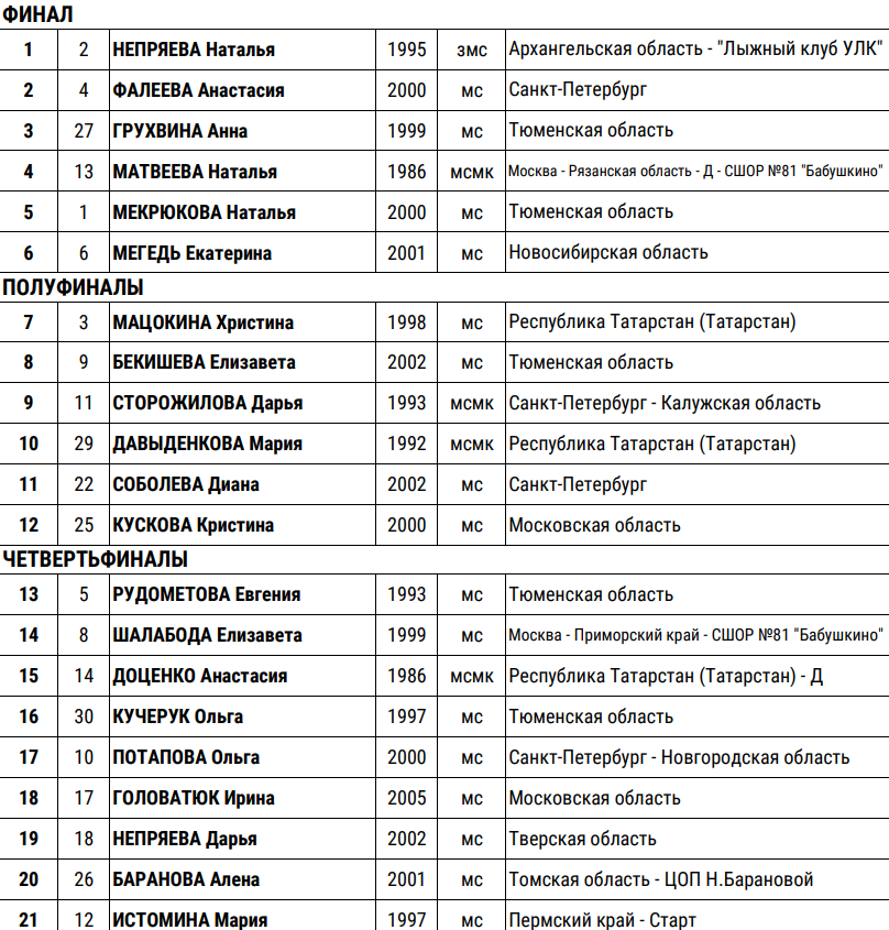 Сегодня, 26 марта 2022 года, в Сыктывкаре стартовал чемпионат России по лыжным гонкам. Спортсмены состязались в спринте свободным стилем. Многие, думаю, смотрели эти гонки! Ещё бы, ведь трансляция велась на Первом канале России - невиданное прежде событие Чемпионат России Республика Коми, г. Сыктывкар - РЛК имени Раисы Сметаниной Результаты Спринт СВ. Женщины Спринт СВ. Мужчины Высокая конкуренция Бытует мнение, что нашим лидерам на российском уровне будет и было скучно. Позволю себе с вышеуказанным мнением не согласиться. Во всех забегах была борьба, при том, очень даже интересная и плотная- Наталья Непряева, Александр Большунов включались на полную. Или вон, Артём Мальцев (57 место), Денис Спицов (58 место), Сергей Ардашев (56 место) вообще даже квалификацию пройти не смогли. Похоже, что наши молодые отлично разогнались на Чемпионате мира и теперь бегут так как от них ожидали перед началом сезона - классно! Там же классно разбежались дерзкие юниоры Савелий Коростелёв и Лиза Бекишева.