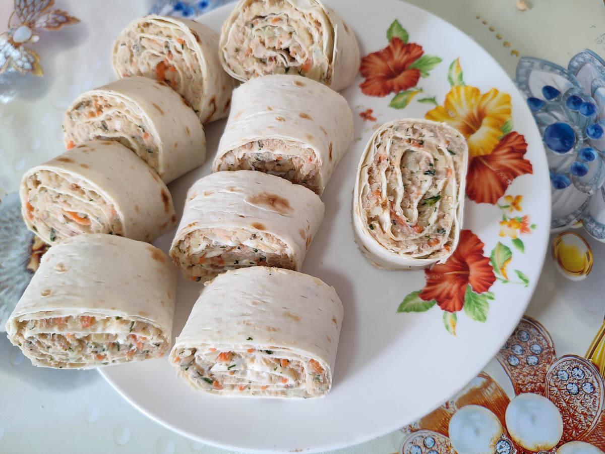 Это мой экспериментальный рулетик. Начинка получилась из того, что нашла в холодильнике. - 1 лист лаваша - баночка консервы ( у меня горбуша в собственном соку) - 2 отварные картофелины - 1/2 чать луковицы - немного моркови по корейски - зелень - майонез ПРИГОТОВЛЕНИЕ: Консерву разнимаю вилкой (сок сливаю), добавляю мелко нарезанный лук, зелень, морковь, на крупной терке натираю картофель, майонез и все хорошо перемешиваю. На лист лаваша равномерно выкладываю начинук. Сворачиваю рулетом, чтобы край не разворачивался, слегка смачиваю водой и закручиваю. Нарезаю порционно. По вкусу получилось довольно неплохо, по желанию можете добавить отварное яйцо натертое на крупной терке, будет более нежный вкус. Приятного аппетита:)