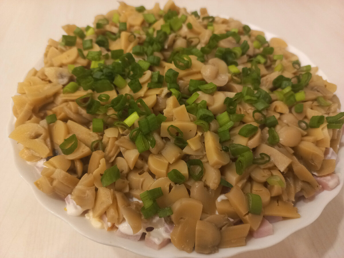 Один из моих любимых салатов, сочетающий в себе простоту приготовления и доступность ингредиентов. Удачное сочетание всех продуктов делает его очень вкусным и сытным. Этот салат отлично подойдёт на обед или ужин. Мне и моей семье этот салат очень понравился, теперь я готовлю его часто. Ингредиенты: Шаг 1. Картошку моем, чистим и варим до готовности. Яйца отвариваем вкрутую (варить 8-10 мин. после закипания воды). После того как яйца сварились кладём их в холодную воду и даём остыть. Яйца чистим. Картофель натираем на крупной тёрке, а яйца на мелкой тёрке. Шаг 2. На дно тарелки укладываем натёртый картофель (можно посолить) и смазываем майонезом. Шаг 3. Затем берём часть лука (остальная часть пойдёт на украшение), промываем и нарезаем и кладём к картошке, смазываем майонезом. Шаг 4. Затем кладём в тарелку натёртые на мелкой тёрке яйца и смазываем майонезом. Шаг 5. Затем нарезаем ветчину кубиком кладём в тарелку смазываем майонезом. Шаг 6. Затем нарезаем маринованные грибы как можно