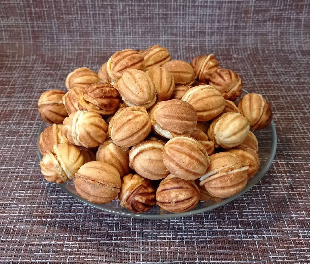 #бабушкинакухня Очень вкусные орешки, как из детства. Количество ингредиентов рассчитано на 72 орешка (144 половинки). Вес готового ореха 15-17 гр. Дополнительно: потребуется орешница. Ингредиенты: гр сливочного масла (комнатной температуры), гр муки, гр сахара, яйца, ч.л соли, ч.л разрыхлителя, ч.л ванилина, гр варёной сгущёнки, растительного масла (для жарки) Способ приготовления: В миску насыпать муку, соль, разрыхлитель, ванилин. Перемешать. Добавить сливочное масло и перетереть в крошку. В другой миске соединить яйца с сахаром. Взбить вечиком или миксером до пышной массы. В миску с мукой вылить яичную массу и замесить тесто. Готовое тесто убрать под плёнку в холодильник на 40 минут. Из теста скатать шарики (вес шарика 5 гр.). Орешницу смазать растительным маслом и выложить шарики в ячейки. Обжарить с двух сторон. Остудить. У орешек лишние края обрезать. Намазать каждую половинку сгущёнкой. Соединить две половинки между собой. Орешки готовы. Приятного аппетита!