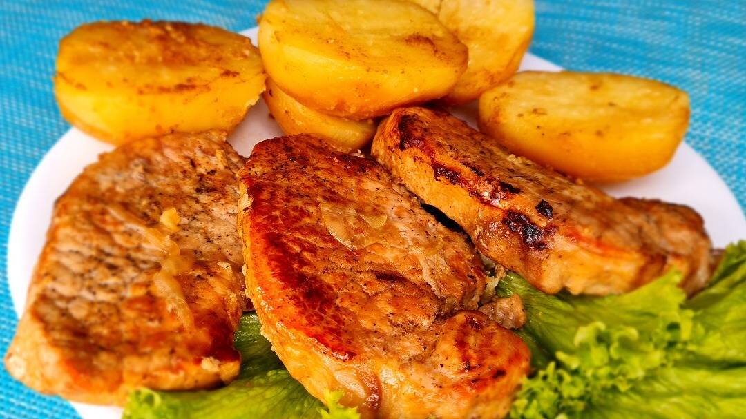 #вкусныйужин #чтоприготовитьизкурицы #быстроивкусноприготовить #обедбыстроивкусно #издоступныхпродуктов #вкусныйрецепт #простойрецепт #вкусноготовим #ужиндлявсейсемьи #чтоприготовитьизяиц #воткакнужноготовить #быстрыйрецепт #вкусныйрецепт #готовлюдомаготовлювкусно Ингредиенты: Свинина, Лук, Картофель, Соль, Черный молотый перец, Паприка, Сухой чеснок, Соевый соус, Растительное масло Способ приготовления: Мясо нарезать на порционные кусочки (толщина 3 – 4 см), посолить и поперчить. Лук нарезать полукольцами, заправить соевым соусом и растительным маслом. В тарелку уложить маринованный лук и куски мяса. Емкость накрыть пищевой пленкой, чтобы ароматы специй не улетучивались и мясо не обветривалось. Оставить мариноваться на 1-2 часа при комнатной температуре. После мясо обжарить на сильном огне без масла до румяности. Очистить картофель и отварить его после закипания в течение 5 минут. После достать картофель из воды добавить растительное масло - 10 мл, соль, черный молотый перец, сухой че