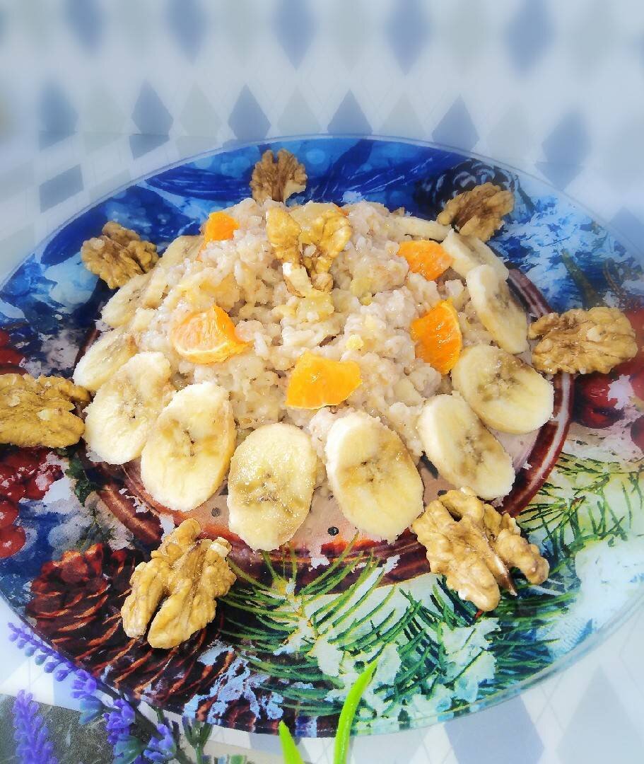 #готовимвместе #меню #пост Ингредиенты: овсяных хлопьев, овсяного молока, соли, сахара, цукатов, банан, мандарина, Грецкие орехи Способ приготовления: Овсяное молоко вылить в кастрюлю и довести до кипения, добавить соль, сахар, цукаты (у меня ананас +папайя), овсянку, перемешать. Варить на среднем огне 5 минут (хлопья у меня 5-ти минутка) при постоянном помешивании. Затем убрать с огня, оставить на 5 минут настояться. При подаче дополнительно можно добавить любимые фрукты и орехи. Приятного аппетита! Если вам понравился мой рецепт и вы приготовите по нему - мне будет очень приятно получить фотоотзыв! 🤗💐🤝