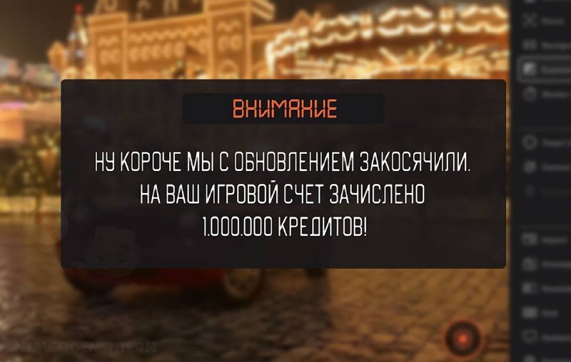 Причем не только словесно, но и материально. Те, кто успел обзавестись игрой до предыдущего обновления, могут получить 1 000 000 «кредитов» в качестве награды, просто разово открыв игру до 25 апреля.