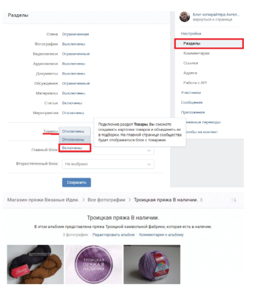 Чтобы включить товары в сообществе, нажмите на «Управление», в открывшемся окне с настройками кликните по ссылке «Разделы», найдите в списке «Товары» и измените их статус на «Включены».