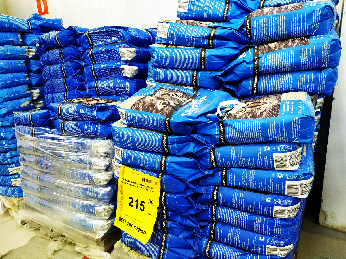 Кошачий наполнитель "Котофей", в мешке 8,1 кг. Цена 215 рублей.