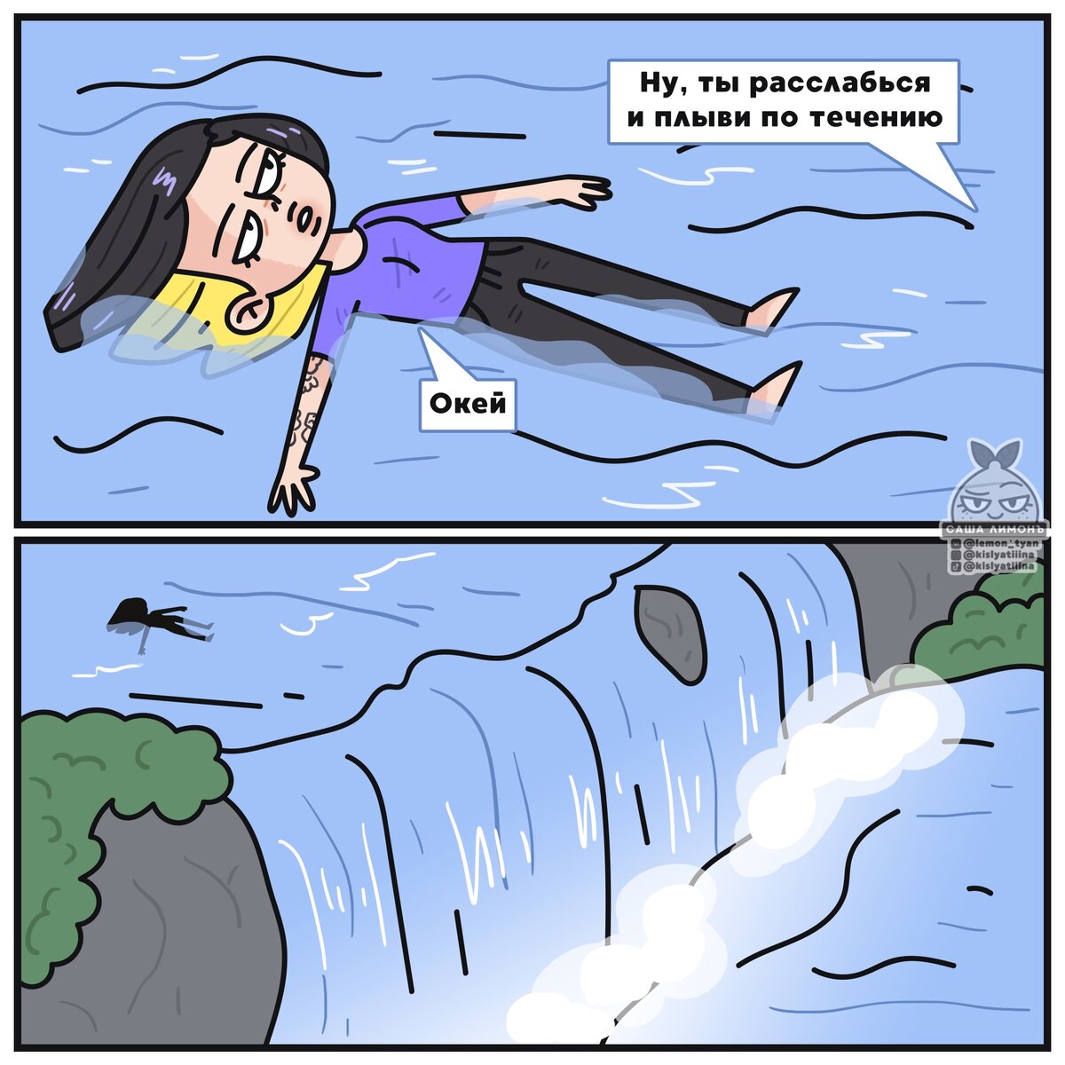 От актуальной повестки сейчас все сложнее куда-то деться: все-таки художники и иллюстраторы - это тоже люди, а значит им также нужно хоть как-то выплескивать свои эмоции. О художнице (хотя она просит называть себя иллюстратором), которая стала героем сегодняшней статьи, я уже давно хотел написать большой материал, тем более что ее комиксы уже не раз мелькали в моих подборках. Но сейчас для этого появился отдельный повод - все последние работы той самой художницы оказались настолько актуальными и жизненными, что я уже просто не мог откладывать рассказ о ней. Поэтому хватит вступительных слов - перейдем к рассказу об авторе и, конечно же, к комиксам. саша лимонъ (также известная, как Саша Кислая) - это дизайнер, иллюстратор и автор комиксов из Москвы. Саша имеет высшее образование по специальности «Графический дизайн». С 2013 года она ведет свой творческий паблик на сайте ВКонтакте, где делится с подписчиками своими работами - различными иллюстрациями и небольшими комиксами. Как утвержда