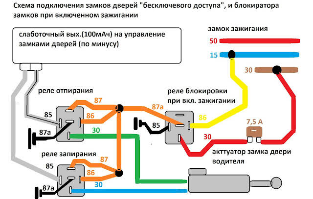 Схема подключения замков дверей "бесключевого доступа", и блокировки управления замками при включенном зажигании ( чтобы замки не закрывались пока вы едите, так как таблицы программирования на бесключевой доступ, я не нашел)