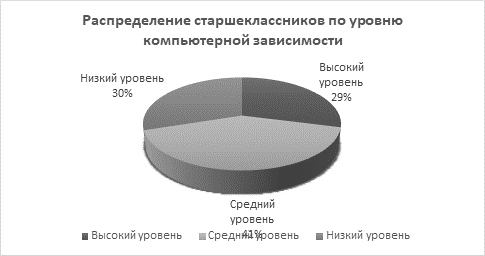 Как показано на рисунке 1, проявление компьютерной зависимости у старшеклассников носит уровневый характер. Выделены три группы испытуемых с возможными уровнями компьютерной зависимости: с выраженными признаками зависимого поведения (высокий уровень) (29%), со слабо выраженными признаками зависимого поведения (41%) и группа испытуемых с отсутствием выраженных признаков зависимого поведения не имеющие компьютерную зависимость (30%). Таким образом, довольно большой процент старшеклассников имеют компьютерную зависимость, что оказывает негативное влияние на здоровье и поведение старшеклассника, на возникновение проблем в учебе, отношениях с окружающими.