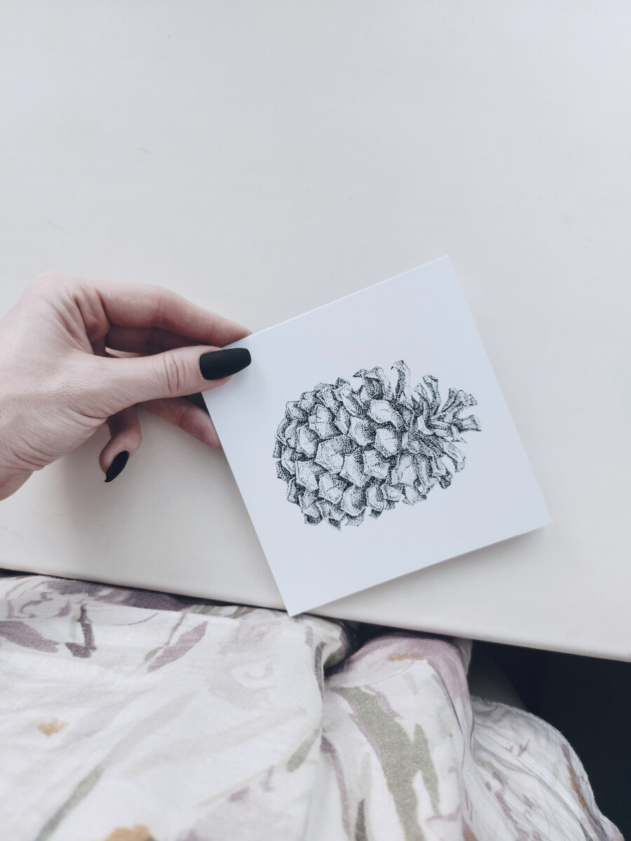 Первые работы в технике пуантилизм были совсем маленькие, примерно 10 на 10 см, хотя времени уходило около 3-5 часов на такой квадратик. Многовато, но меня так успокаивала эта монотонная работа, ну а что, тыкаешь и тыкаешь. Мои художественные навыки помогли мне легко работать со светотенью. Как сейчас помню был уже конец ноября и я хотела создать какие нибудь зимние рисунки, которые можно было бы дарить людям как открытки в дополнение к новогодним подаркам. Кстати, про открытки это отдельная тема - я их обожаю, и в детстве я мечтала, чтобы у меня их было миллион всяких разных под любой повод. Но их было мало и я просто их копила и любовалась. И тут появилась возможность сделать их самой, я была в восторге) Я сделала несколько рисунков: 2 вида шишек, 2 вида веточек и 1 паттерн Как то так сложилось, что они сразу собрались в набор и идеально подходили друг другу. Хотя это не чудо, думаю, здесь просто сыграла моя художественная насмотренность. Каждая открытка занимала очень много време