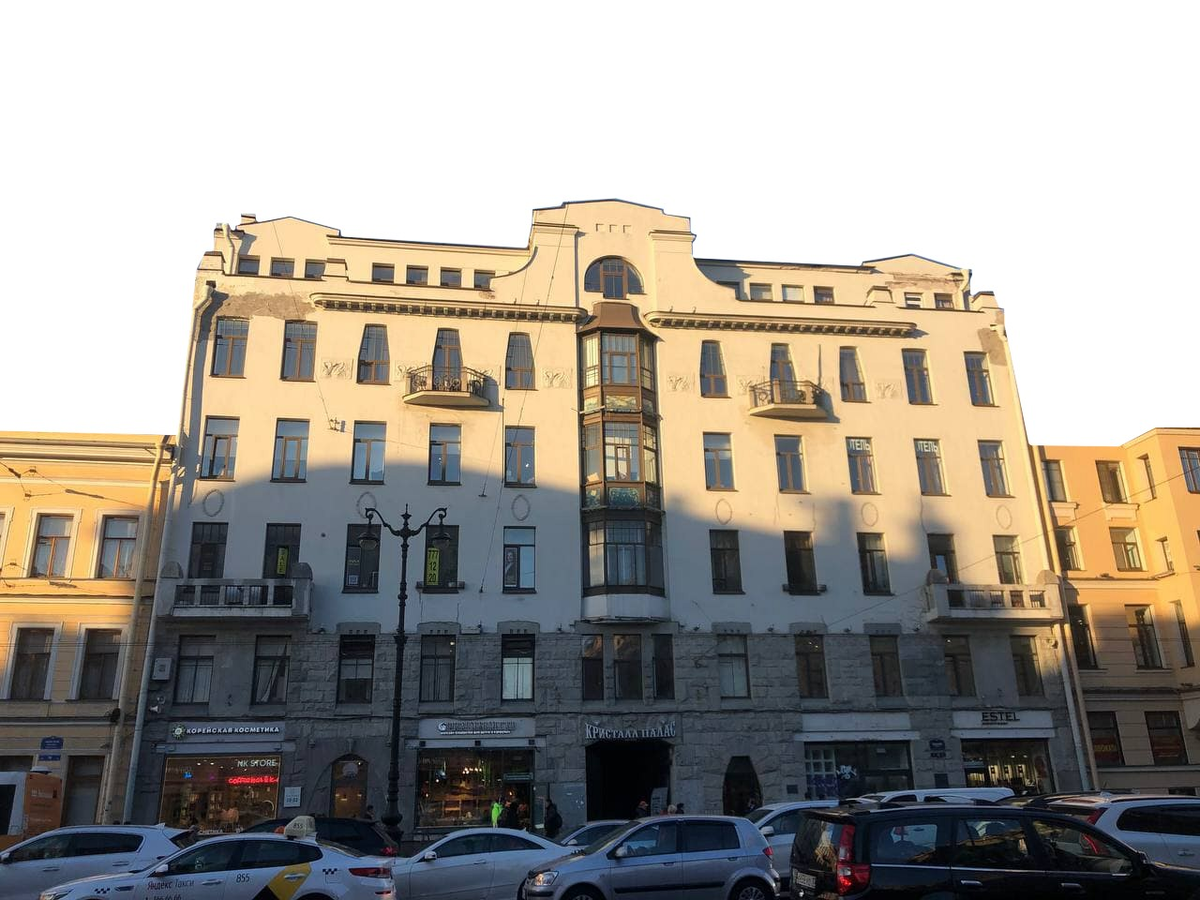 "Только что открытый фасад дома против Троицкой улицы [сегодня это ул. Рубинштейна] на Невском проспекте представляет вопиющие, по своей несогласованности со всею, уже годами установившеюся, физиономией проспекта, вольнодумство; пошлейшие формы эклектического затасканного петербургского ренессанса гораздо спокойнее и терпимее рядом с этим «чухонским модерном», украшенным какими-то головами «леших», и выкрашенный в светло-коричневый тон" - так писал об этом ныне светло-сером доме видный архитектурный критик Георгий Лукомский в 1910 году, сразу после его постройки. Архитектор, а точнее гражданский инженер, Сима Минаш, который спроектировал этот доходный дом для княгини Воейковой, прославился в первую очередь оформлением Витебского вокзала. Невскопроспектное творение современники сначала сильно невзлюбили и даже обвиняли архитектора в плагиате. Однако вскоре все квартиры были заселены, в некоторые из них даже въехали коммерческие фирмы, которых и сегодня на Невском гораздо больше, чем жил