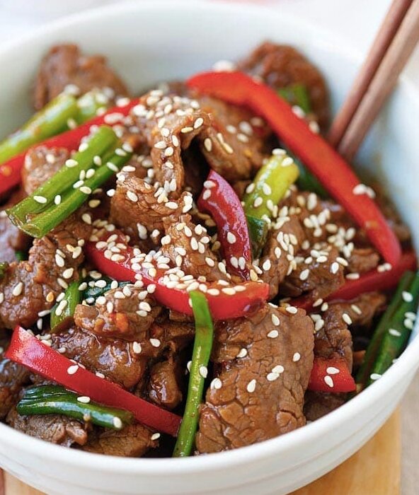 Говядина в кунжуте — самый простой стир-фрай, дающий нежную и сочную говядину с убийственным соево-кунжутным соусом. Так вкусно, что вам захочется добавки! Чтобы получить нежные, гладкие, шелковистые куски говядины ресторанного качества, замаринуйте нарезанную говядину в кукурузном крахмале. Это запечатывает влагу в говядине и делает ее нежной после приготовления. Кунжутное масло — секретный ингредиент в этом рецепте, поскольку оно придает говядине суперароматный и аппетитный вкус поджаренного кунжута. Какую говядину лучше использовать? Если у вас мало времени, вы можете купить в супермаркетах предварительно нарезанный стейк. Если вы не едите говядину, вы можете заменить ее курицей, нарезанной тонкими ломтиками, и у вас получится не менее восхитительное блюдо. Ингредиенты: Маринад: Приготовление: Приятного аппетита!