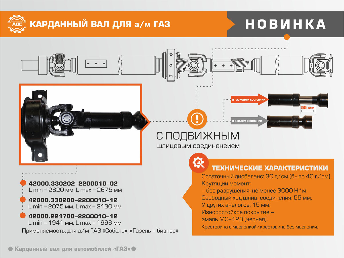 Модернизированные карданные валы имеют подвижное шлицевое соединение, снимающее ударную осевую нагрузку на промежуточную опору вала. Кроме этого, при производстве «АДС» использует гофрочехол и защитные отражатели, которые исключают попадание пыли, грязи и влаги в течение всего срока эксплуатации.