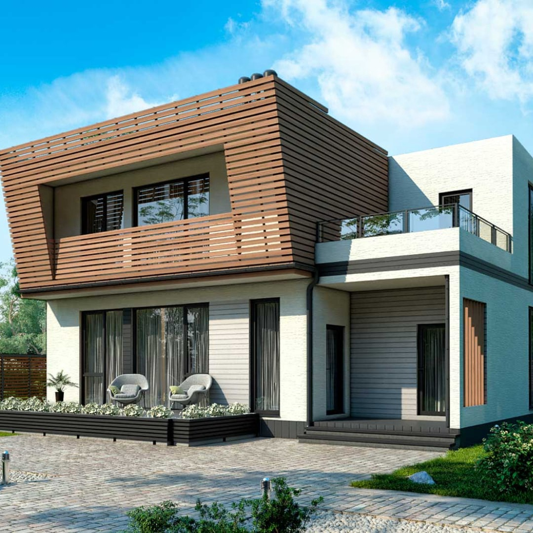 Проект оформлен в современном минималистичном стиле. Фасад выполнен из фиброцементных панелей в сочетании с деревом.