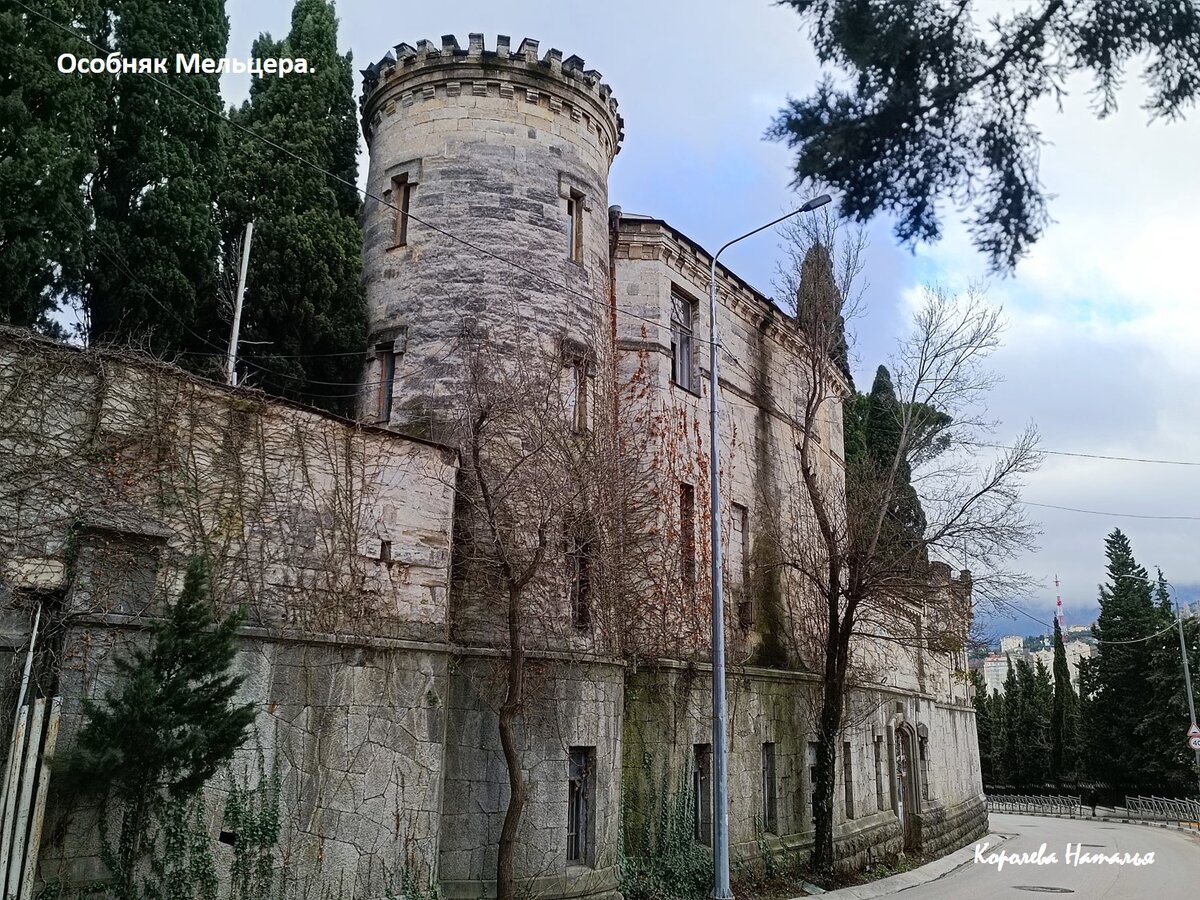Переходим к следующему объекту. Здание Гестапо, как называют его ялтинцы, находится на ул. Свердлова д.43. Особняк с виду напоминающего замок. Есть две версии его постройки. По одной из них - здание было воздвигнуто в 1901 г для дворянина В.Е. Овчинникова и в дальнейшем продано Федору Мельцеру. По-другой версии, особняк изначально строился для Мельцера, но уже в 1914 году.