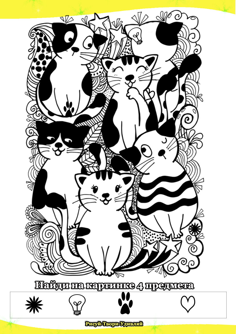 Уделите немного своего драгоценного времени на тренировку мозга. Ведь считается, что решение логических головоломок, заданий на внимательность и смекалку - отличная профилактика умственных заболеваний. Ведь если делать такую "гимнастику для ума", мозгу будет обеспечена постоянная умственная деятельность. Приглашаю вас на канал "Мозг, разомнись". Здесь вы найдёте "зарядку для ума". Переходите по ссылке, подписывайтесь, если интересно: Ну что, разомнём наш мозг? Давайте проверим насколько вы внимательны и потренируем зрительные навыки. А помогут нам в этом картинки с симпатичными кошечками. Предлагаю вам 2 задания. Задание 1. #найди предмет Отыщи спрятанные предметы на картинке На этой картинке среди милых котиков спрятались 4 предмета: цветок, лампочка, отпечаток лапы и сердечко. Рассмотрите картинку хорошенько и найдите их на рисунке. На втором фото (в карусели ниже) вы сможете посмотреть правильное расположение картинок, которые спрятаны. Но не торопитесь подсмотреть, куда интерес