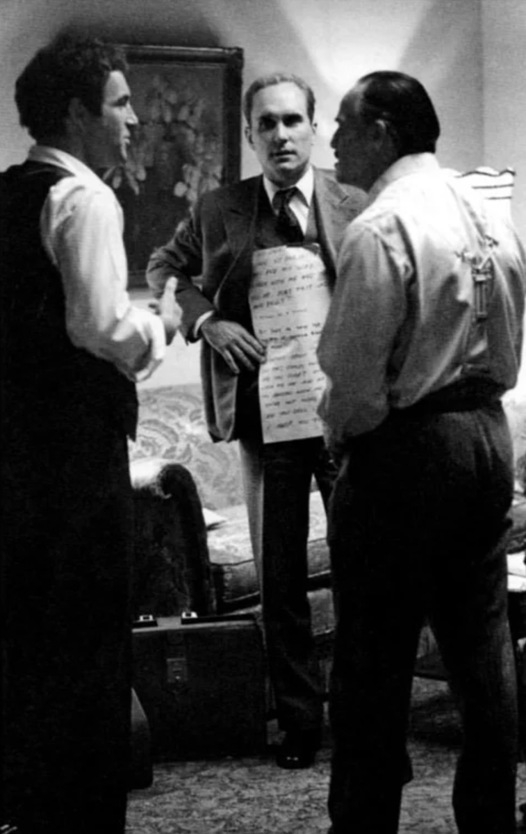 Эту фотографию со съемок «Крестного отца» (ниже) знают многие. Марлон Брандо к 1970-м уже превратился из актера-гения в несносного актера-гения, который постоянно опаздывал на съемки, сбивал всем графики, отказывался учить роли. И Коппола оказался в его карьере последним большим режиссером, который не просто это терпел, но и сумел выжать из зрелого Брандо максимум. Сначала в «Крестном отце», а затем — в «Апокалипсисе сегодня». Думаю, многие знают и историю о том, как Коппола сражался за него перед съемками гангстерского эпоса. Но я все же её перескажу. Великий оскароносный актер в то время испытывал первый профессиональный кризис в карьере. В 1940-50-е Брандо стал чуть ли не главным секс-символом Голливуда и снимался в первоклассном кино — от «Трамвая Желание» и «В порту» до «Сайонары» и «Парней и куколок». И был синонимом кассового успеха большинства картин со своим участием. Но в 1960-е же Брандо, увлекшись режиссурой и потерпев несколько оглушительных коммерческих провалов в качес