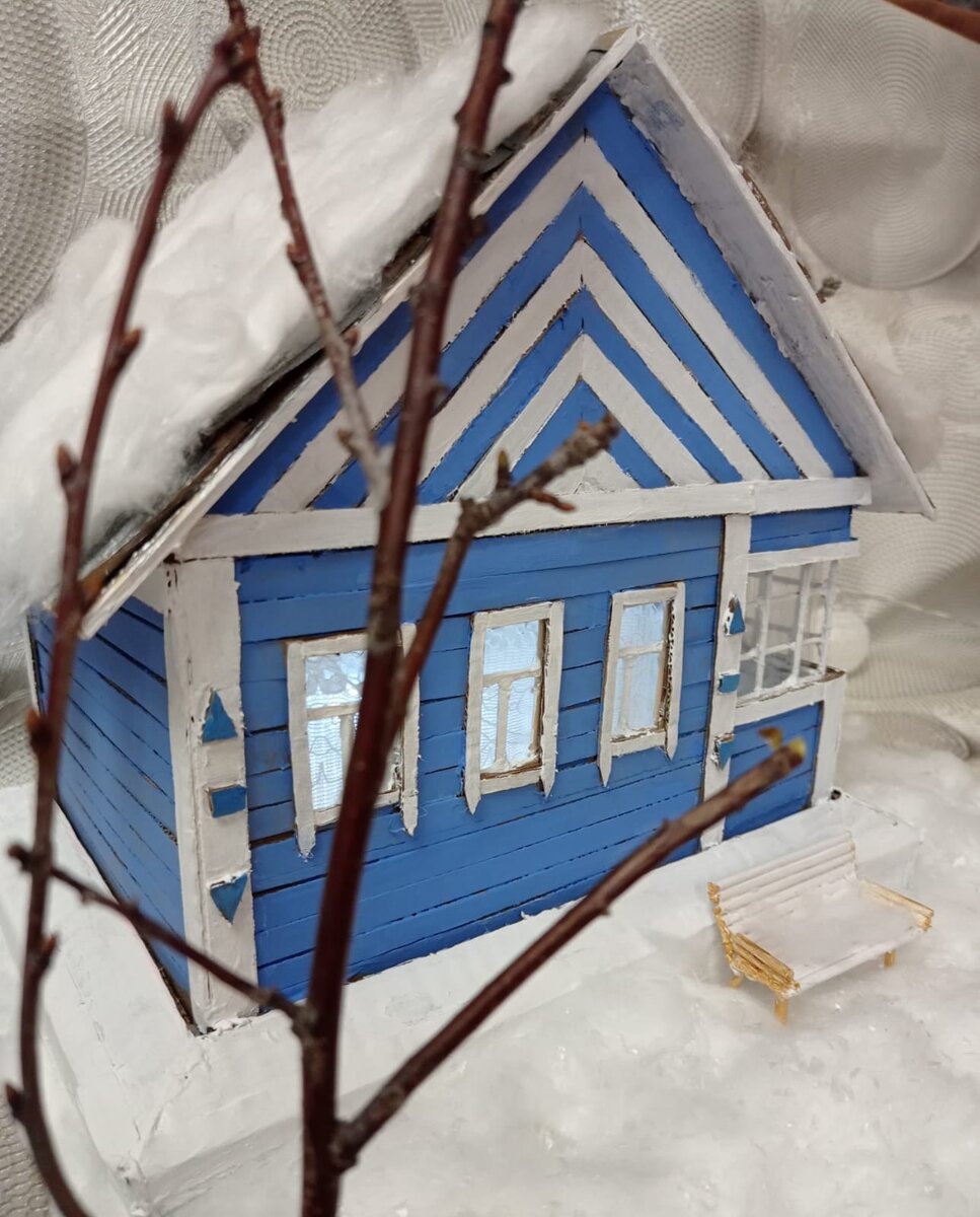 Авыл өйләре бик ямьле һәм күңелгә якын бит ул. Кышкы кичләрнең берсендә, авылымның матур йортларына сокланып йөргәндә, күңелемдә шундый бер йортны ясап карау теләге туды. Һәм шул кичне ук эшкә тотындым. Катыргы тартмаларны сүттем, үлчәдем, кистем. Йортның нигезен ясадым, диварларын ябыштырдым. Шуннан соң, 1-2 атна тукталып тордым, илһам качты, диләрме соң әле. Мин теләгәнчә матур да чыкмый кебек, бик авыр эш икән, яктан караганда гына җинел кебек. Аннан, болай булмый дип, үземне кулга алып, яңадан башладым. Тәрәзәләр уйдым, кашагаларын ясадым. Катыргыны тар-тар кисәкләргә кисеп, өйне тышлый башладым. Әзрәк ямь керә башлады кебек өемә. Кайбер идеяләр эш барышында килеп чыга. Өйнең түбәсен ничек ясарга дип уйланып йоргәндә, нәрсәгәдер ачуым килеп, катыргы тартманы ертып җибәргән идем, урталай аергач, ул нәкъ шифер кебек, дулкын-дулкын икән. Менә, түбәле дә булдым. Тәрәзәмә челтәрләр элдем. Аннары өйне акрил буяулар белән буядым. Мамыктан кар көртләре ясадым һәм ву-а-ля, кышкы авыл өе әзе