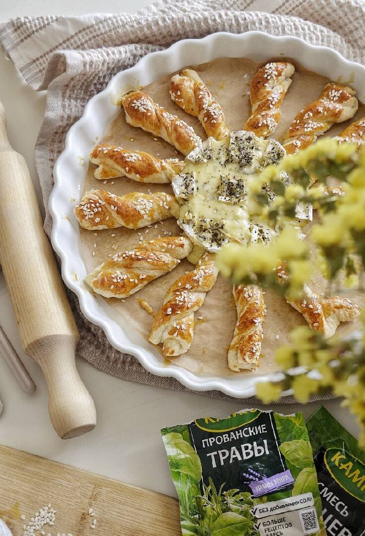 Если хотите удивить гостей вкусной закуской, приготовьте сыр камамбер в духовке. Мягкий и тягучий расплавленный сыр с пикантным вкусом. Ооочень ✅вкусно!!! ✅красиво!!! ✅быстро!!! ✏Итак, для приготовления понадобится: Ингредиенты: Сыра камамбер, Яичный желток для смазывания теста, Семечки кунжута, Оливковое масло, Приправы, чеснок Способ приготовления: Камамбер надрезаем, добавляем прованские травы, перец, чеснок и оливковое масло. Тесто раскатать по форме, в центр кладем сыр, по кругу делим тесто на равные полоски, которые скручиваем спиралькой. Смазываем желтком и посыпаем кунжутом. Ставим в разогретую духовку (до 180°) на 15-20 минут. Во время запекания по дому распространяется обалденный аромат!!!♡ По готовности сразу подаем на стол, фишка здесь в расплавленном сыре.