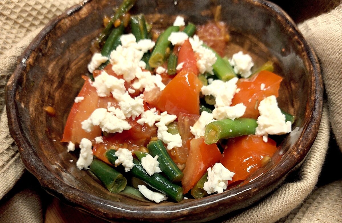 Пока весна еще раскачивается, можно готовить теплые салаты. Этот хорош тем, что из простых ингредиентов получается вкусно. Приступим! Нам потребуется на 1 порцию: - замороженая стручковая фасоль - горсть; - помидоры любого уровня вкусности - горсть; - чеснок - 1 большой зубчик; - оливковое масло; - любимый белый сыр - 2 ст. л. На сковороде разогреваем оливковое масло, тонкими слайсами режем чеснок и отправляем на сковородку. Следим, чтобы чеснок не сгорел - ему много не надо, и добавляем замороженную фасоль. На среднем огне тушим нашу фасоль, когда она растает и станет помягче, добавляем крупно порезанные помидоры. Прекрасно то, что припущенные на сковороде томаты обретают вкус даже в марте, когда все помидоры дешвле 300 р совершенно безвкусны. Тушим наши овощи, пока помидоры не размякнут. Закидываем на сковородку мелко порезанный белый сыр: сулугуни, адыгейский. У меня вот фета. Перемешиваем и раскладываем по тарелкам. Согреваемся. Пробуем почувствовать вкус того, что мы едим.