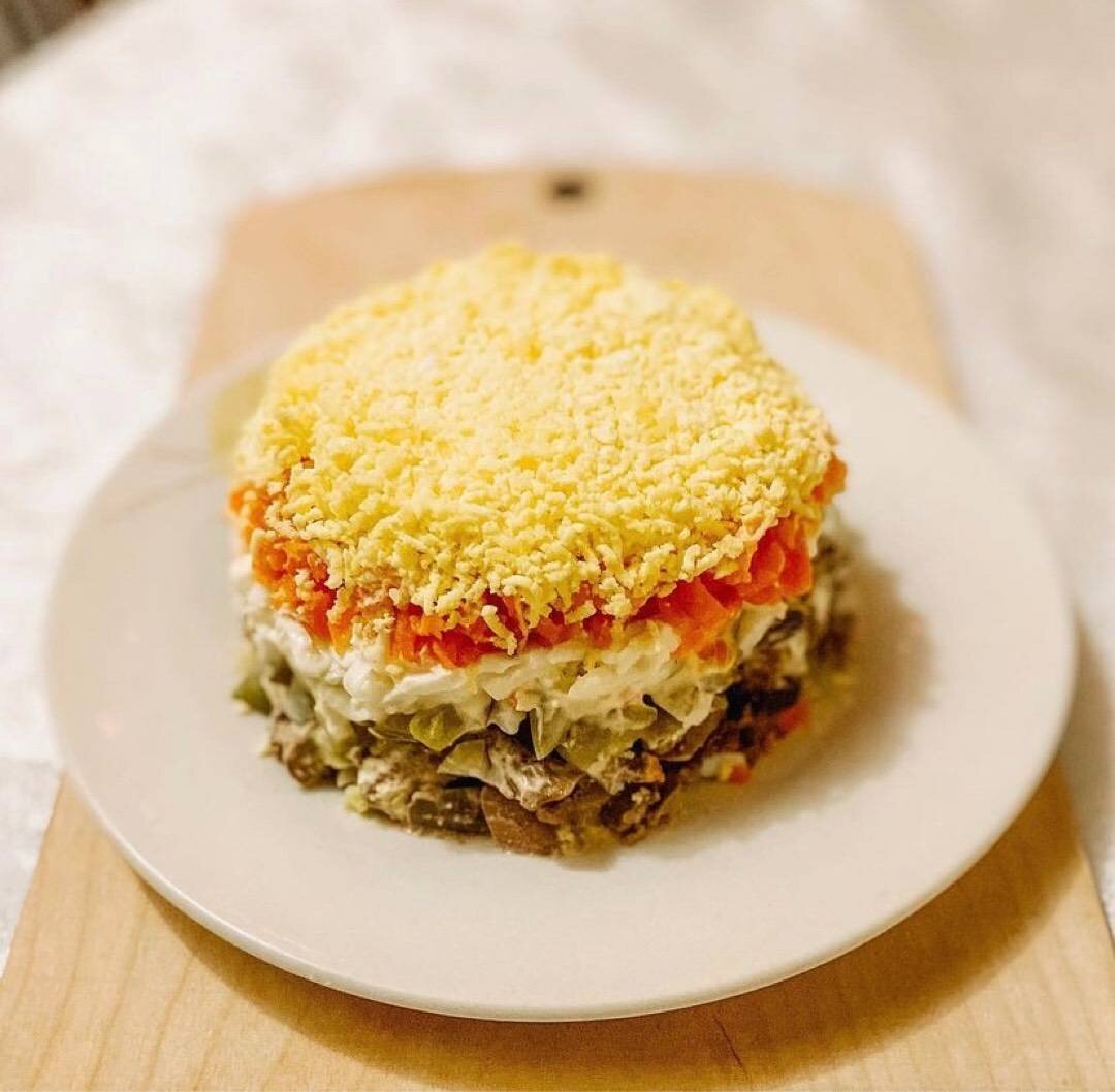 Вкусный и сытный салат. Достаточно бюджетный, а ингредиенты идеально сочетаются! Гости остались довольны. #салат #ужин #салатспеченью #овощнойсалат #салатнапраздник #праздничныйужин #сытныйсалат #салатсмайонезом #закуска #рецепт #рецепты #рецептсалата #печень #печенькуриная #вкусныйсалат Ингредиенты: - куриная печень, - яйца с1, - морковь средняя(или 1 большая), - огурцы маринованные, - лук репчатый, -майонез, -соль Способ приготовления: Куриную печень отварить до готовности в соленой воде. Отварить до готовности яйца, морковь. Лук порезать мелкими кубиками и обжарить на растительном масле до мягкости и золотистого цвета, посолить по вкусу. Куриную печень порезать небольшими кусочками. Морковь натереть на крупной тёрке. Огурцы порезать мелкими кубиками, лишний рассол слить. Яйца разделить на белки и желтки, белки натереть на крупной тёрке, желтки на мелкой. Собираем слои: Куриная печень-майонез-жареный лук-огурцы-майонез, -белки(посолить)-майонез-морковь(посолить)-майонез