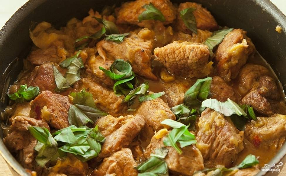 Продукты (на 3 порции) Свинина, филе - 300 г Грибы (маслята или другие грибы) - 130 г Лук репчатый, средний - 1 шт. Чеснок - 2 зубчика Сметана - 2 ст.л. Сыр плавленый - 1 ст.л. Мука - 1 ст.л. Кориандр молотый - 0,5 ч.л. Соль Перец Специи (по желанию) Зелень (укроп, петрушка) Вода - 100-125 мл Свинину порезать небольшими кубиками.