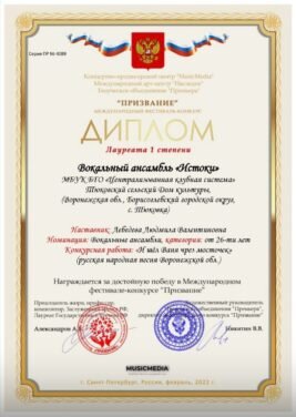 Вокальный ансамбль «Истоки» Тюковского сельского Дома культуры наградили за достойную победу на Международном онлайн-фестивале-конкурсе «Призвание». Вокалисты представили на суд жюри русскую народную песню Воронежской области «И шел Ваня чрез мосточек». Вокалистка Горельского дома культуры Левченко Мария завоевала Лауреат 2 степени. Женщина выступила с песней «Вокальная косточка». Вокальный ансамбль из Петровского сельского Дома культуры «Хоперские зори» также принял участие в конкурсе. Талантливые музыканты спели две русские народные песни: «Раз, два — люблю тебя» и «Напекла кума блинов». Обе конкурсные работы были оценены почетным 2-ым местом. Танцырейский Дом культуры тоже продемонстрировал свои таланты на Международном конкурсе. Театр русской народной песни «Вечерки» представил на конкурс две композиции: русскую народную песню «Течет речка» и «Тихий омут». Обе работы заняли Лауреат 3 степени. Большое количество наград завоевали солисты Танцырейского Дома культуры: Баранов Алексей п