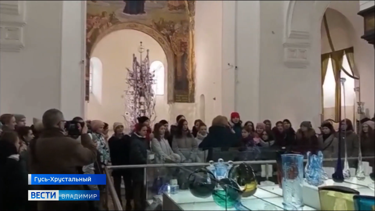 Хрустальные голоса под сводами музея хрусталя. Юные хористы из Владимира устроили незапланированный концерт в бывшем Георгиевском храме, известном всему миру "храме стекла". Перед мозаикой работы Виктора Васнецова "О тебе радуется, благодатная!" прозвучал кондАк Иверской иконы Божьей матери композитора Абросимова. Его исполнил хор старших классов владимирской музыкальной школы имени Танеева. Руководит коллективом Елена Зорина. Хористы приехали в гости к гусевчанам- в музыкальную школу имени Балакирева. А в музей хрусталя пришли на экскурсию. Вести-Владимир