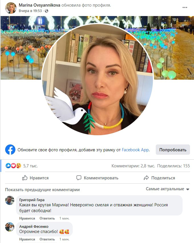 Антивоенный плакат в эфире Первого может привести к уголовке На Марину Овсянникову, которая ворвалась в прямой эфир вечерних новостей с призывом к миру, готовятся завести дело по статье о фейках. «База» пишет, что поначалу инцидент тянул на административку. Однако, посовещавшись, силовики решили раскрутить дело до уголовного. Журналистку обвинят по новой статье 207.3 УК РФ «Публичное распространение заведомо ложной информации об использовании ВС РФ». Она предусматривает до 15 лет лишения свободы. Следственный комитет РФ уже проводит доследственную проверку, а местонахождение самой Овсянниковой неизвестно. Редактор Первого успела записать обращение и сменить фото в профиле заблокированного в стране Фейсбука. Марина продолжает агитировать за мир и собирает немало лайков.