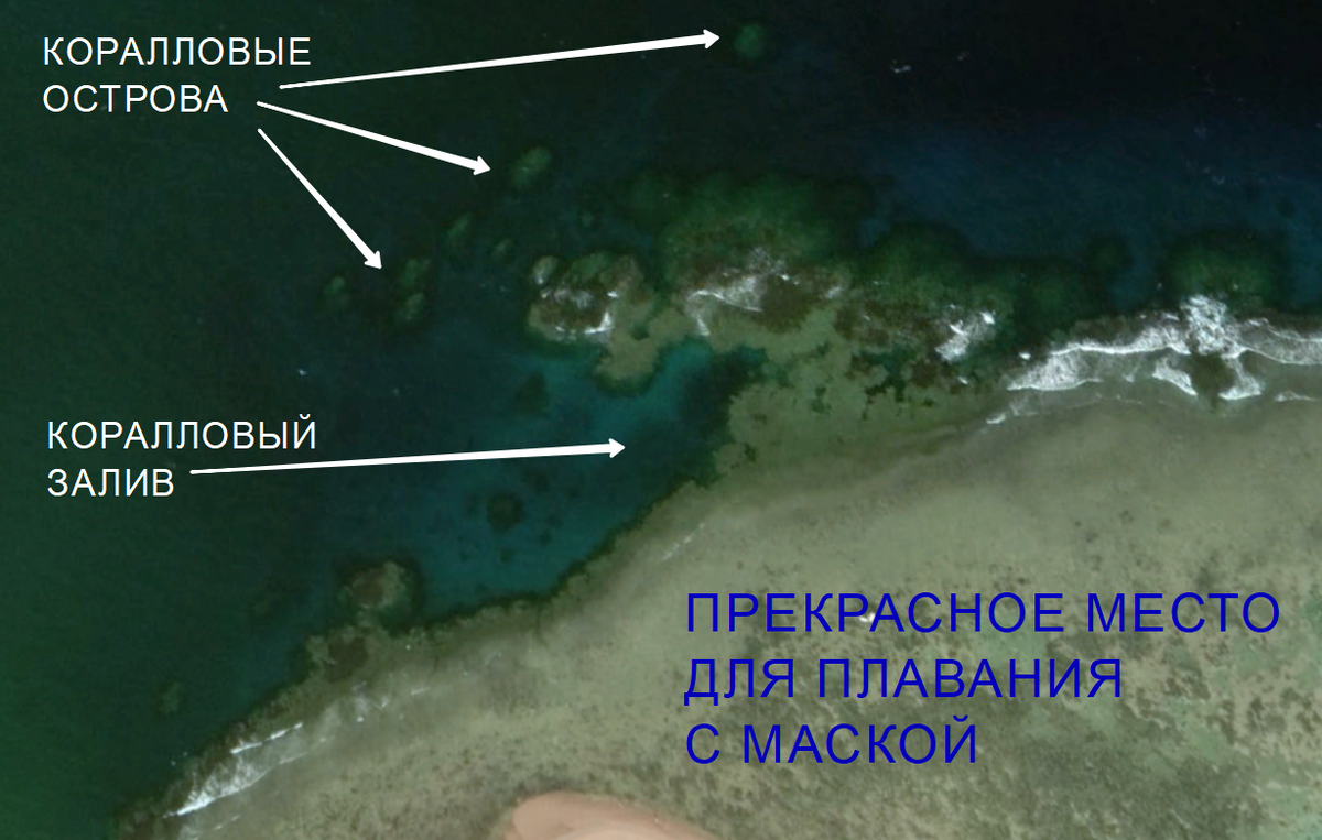 Там прекрасный песчаный пляж и коралл с чудными "береговыми" линиями, полный подводных пещер и лагун, наполненных рыбами, скатами, муренами и прочими красотами флоры и фауны Красного моря.