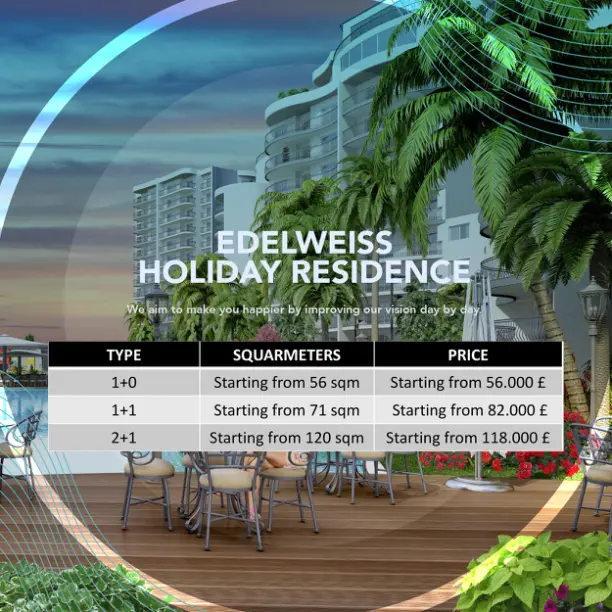 Edelweiss - новый масштабный жилой комплекс класса люкс с широким спектром услуг в городе Искеле на Северном Кипре, в 1,8 км от пляжа Лонг Бич. Edelweiss состоит из 6 современных многоэтажных зданий, спроектированных таким образом, что из окон с террас каждой квартиры открывается панорамный вид на море и горы. На выбор предлагаются апартаменты 3+1, 2+1, 1+1, студии и роскошные пентхаусы. Все апартаменты с индивидуальной планировкой и просторными террасами. В стоимость апартаментов входит внутренняя отделка, кухонные гарнитуры, брендовая сантехника, встроенные шкафы. По желанию клиента устанавливается бытовая техника, кондиционеры, система “Умный дом”. Для отделки используются только высококачественные материалы, в гостиных - ламинированный паркет, в санузлах керамическая плитка. Фасады отделаны натуральным камнем. Комплекс располагается на благоустроенной озелененной территории с большими общественными бассейнами и игровыми зонами для детей. Также предусмотрены магазины, ресторан высок
