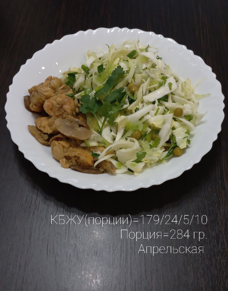 Сегодня на ужин: тушёное филе куриной грудки с шампиньонами; салат из свежей капусты, зеленой редька, горошка и зелени, заправленный льняное маслом.