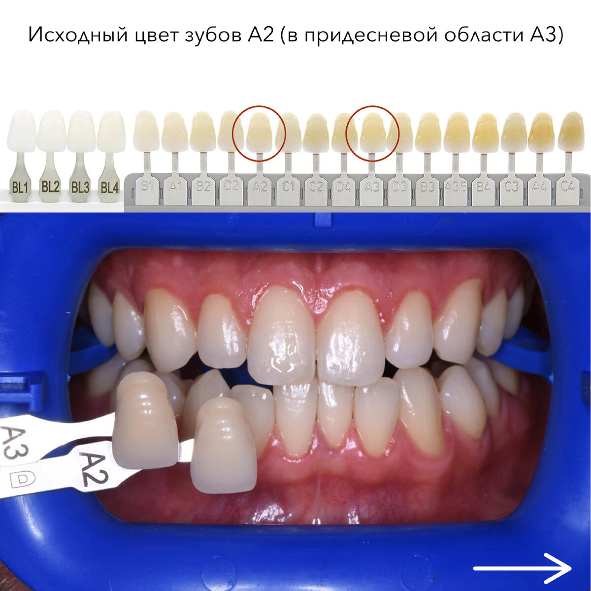 Вы, наверное, слышали в рекламе про отбеливание на 16 тонов. Звучит многообещающе 🙌 А 16 тонов это много или мало? Как измеряют цвет? И почему именно 16? За стандарт определения цвета зубов в 1983 году была принята цветовая шкала Vita classical (вы её видели на обложке этого поста). В ней представлены все встречающиеся оттенки зубов. Каждый имеет букву (A,B,C,D) и цифру 1,2,3,4. Буква обозначает основной оттенок, а цифра - насыщенность. Всего получается 16 тонов. В шкале они располагаются в определённом порядке (B1 A1 B2 D2 А2 С1 С2 D4 A3 D3 B3 A3,5 B4 C3 A4 C4) от самого светлого оттенка В1 к самому темному С4. Отсюда и взялись громкие заявления рекламы про отбеливание на 16 тонов. Реклама,конечно же, выдаёт желаемое за действительное 🤷🏻♀️ На практике отбелить зубы на столько тонов из самого тёмного в самый светлый невозможно по физиологическим особенностям. К тому же у большинства людей оттенок зубов А3 - он располагается ближе к середине шкалы и это уже не 16 тонов до с