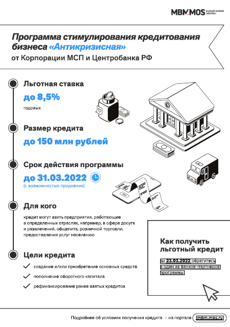 Для дополнительной поддержки бизнеса Корпорация МСП и Центробанк России разработали несколько антикризисных программ льготного кредитования Они позволят предпринимателям привлечь деньги на дальнейшее развитие и адаптироваться к текущей ситуации. Получить кредит можно на разные цели по сниженной процентной ставке. А если у вас не хватает залога, всегда можно обратиться за поручительством в Фонд содействия кредитованию малого бизнеса Москвы – он окажет гарантийную поддержку на льготных условиях. Кредиты предоставляются компаниям и ИП, входящим в единый реестр субъектов МСП и не находящимся в стадии банкротства. 1. ПСК «Антикризисная» Программа стимулирования кредитования доступна предпринимателям, работающим в определенных отраслях, например, в сфере досуга и развлечений, общепита, розничной торговли, предоставления услуг населению. С полным перечнем ОКВЭД можно ознакомиться во вложении (он может быть основным или дополнительным). В рамках программы бизнес может привлечь до 150 млн рубл