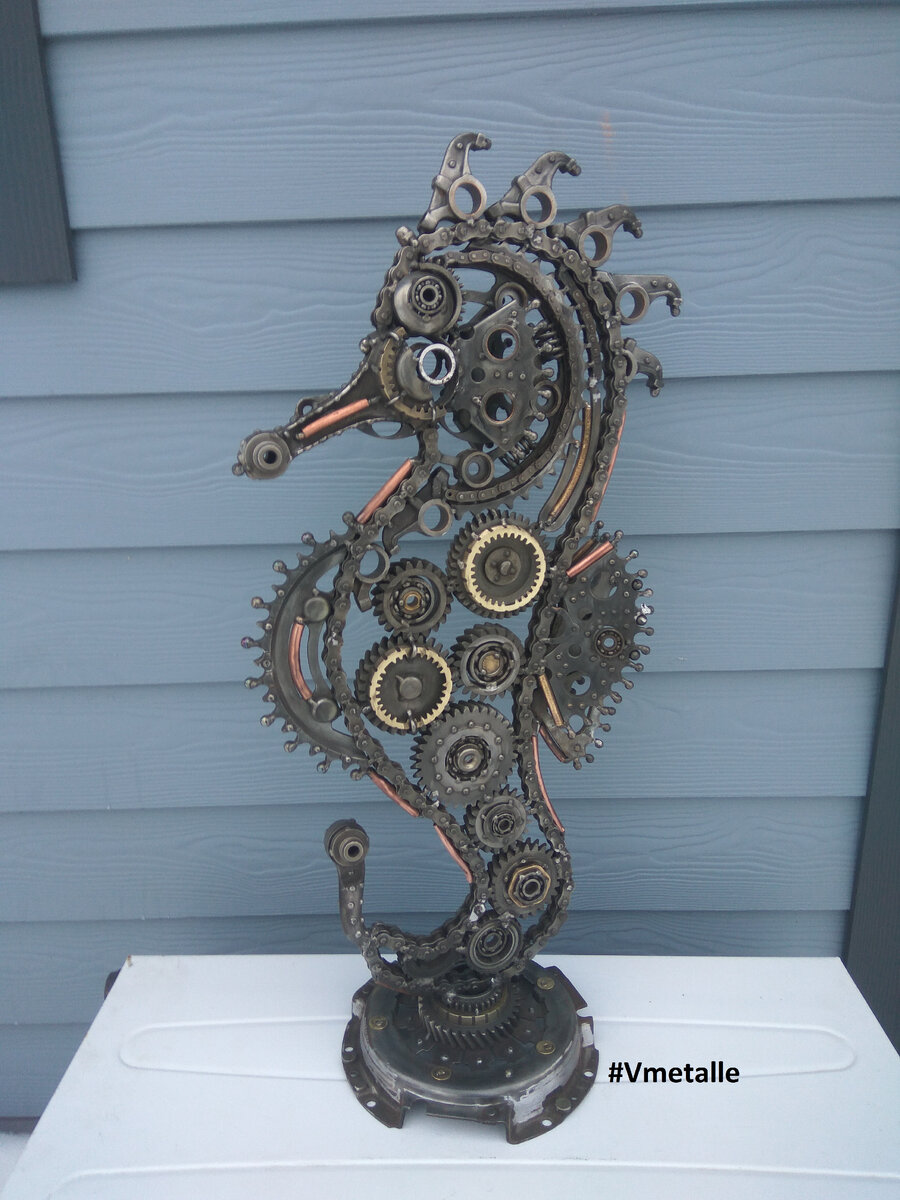 Те для кого-то это утиль и мусор,а для нас сырье и материалы для творчества. На этот раз я решил разбавить серые будни цветными элементами,максимально,насколько можно и нужно,но без крайностей . Поэтому на фоне серого металла появились медные и латунные элементы - как всегда это автомобильная тематика - синхронизаторы коробок передач,тормозные трубки и фитинги. И да,в тело вписались тяжёлые шестерни коробки передач. Набивка двух сторон немного отличается-так интереснее;) Вот такой получился конь огонь. ЗЫ: При создании коня пострадало три коробки передач Ваз классика.Аминь...