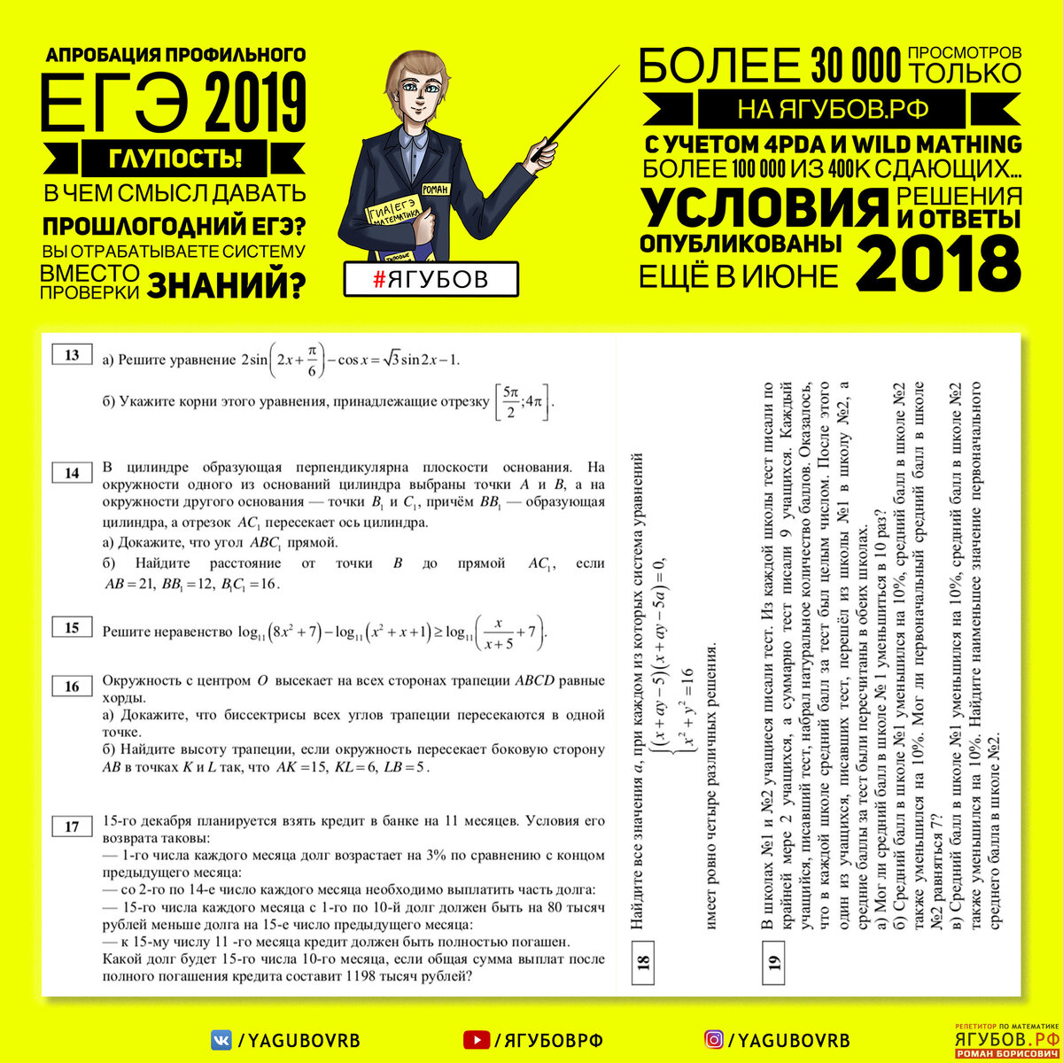Эти задания опубликованы мной и многими другими ещё июне 2018. Все задания есть в сборнике! До них можно добраться в один клик с главной страницы. Все задания вместе с ответами и решениями «висят» уже полгода. На какой результат вы рассчитываете, если задания под моей редакции посмотрело более 100 000 человек. Это без учета других редакций и офлайн просмотров. Реальные цифры могут говорить о том, что 100% готовящихся учеников (обычно 400К каждый год) хотя бы раз видели подобные задания до этой апробации.