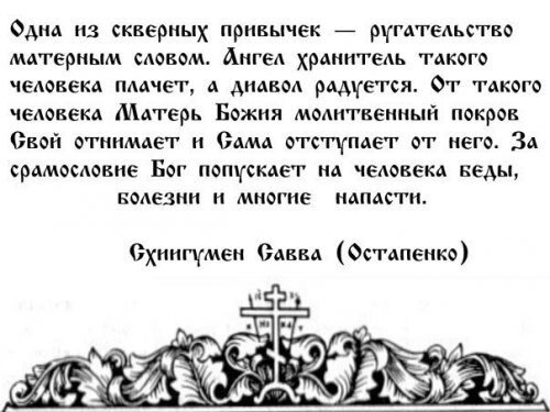 Старец Схиигумен Савва (Остапенко): «Одна из скверных привычек — ругательство матерным словом. Во время ругательства у сквернословца... паром скверным смрад исходит из уст его: такому человеку, если не раскается, нельзя в церковь Божию входить и прикасаться к святыне. Ангел Хранитель такого человека плачет, а диавол радуется. От такого человека Матерь Божия молитвенный покров Свой отнимает и Сама отступает от него. Такой человек проклятью себя подвергает. С таким человеком нельзя нам есть и пить, пока не перестанет браниться матерным словом. За срамословие Бог попускает на человека беды, болезни и многие напасти. Поэтому отстанем от обычая нечестивых людей и послушаем апостола Павла, увещевающего: «Всяко слово гнило да не исходит из уст ваших» (Еф 4, 29), но лучше Иисусову молитву восприимем в уста свои и в сердце и тем избавлены будем вечной муки во веки веков. Аминь»[4].
