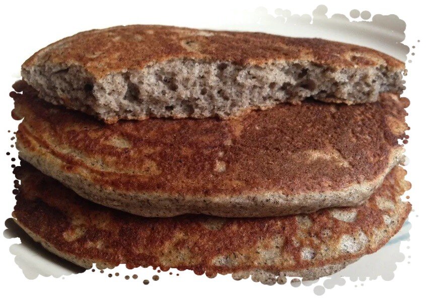 2 стакана гречневой муки, 2 стакана пшеничной муки, 1 стакан воды, 2—3 стакана молока, 3 ст. ложки масла, 3 яйца, 15 г дрожжей, соль, немного сахара, жир для жаренья. Один стакан гречневой муки заварить стаканом кипятка и хорошо растереть. Когда тесто остынет, добавить стакан пшеничной муки, стакан молока и растертые с сахаром дрожжи. Выбитое тесто поставить в теплое место, чтобы оно поднялась. В хорошо растертое масло положить желтки, сахар и растирать до образования пышной массы. Когда тесто достаточно поднимется, добавить в него растертое с желтками масло, соль, подогретое остальное молоко, остаток муки, хорошо перемешать и дать тесту вторично подняться. Когда тесто подойдет во второй раз, ввести взбитые белки, осторожно перемешать и жарить оладьи на сковороде с хорошо разогретым жиром. Затем выложить оладьи в кастрюлю, накрыть крышкой и поставить ненадолго в духовку. Эти оладьи подают со сметаной.