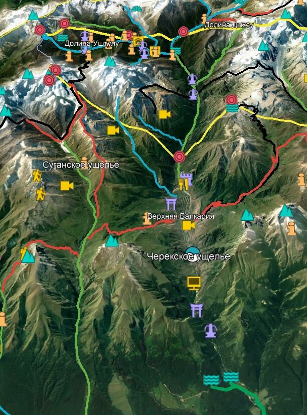 В разделе указаны основные/базовые места и направления для туристов без указания описаний турбаз, маршрутов, перевалов, ледников, вершин. Места указаны для общего представления местности. К каждому месту имеется свое описание, которое представлено на ресурсе «кбр07.рф», маршруты с описанием размещены на онлайн карте «Туристическая карта КБР», а также указаны места для размещения лагеря, кемпинга.