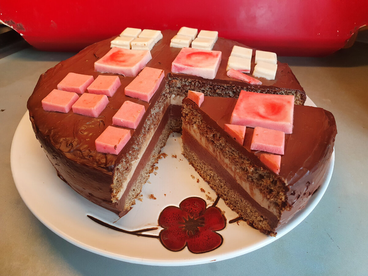 О том, как испечь бисквит без духовки, можно посмотреть тут ⇓ Или используйте любой ваш любимый рецепт и испеките бисквит по нему. А сейчас приступим к начинке. Мое недавнее открытие – агар-агар. Работать с ним оказалось легко и приятно. Смесь застывает уже при 60С, что удобно, когда дома жарко. А еще это растительный продукт, а значит подойдет для вегетарианцев и постящихся. Для этого варианта сборки бисквит нужно поместить в кулинарное кольцо или форму с бортами, по размеру равную диаметру коржа. Ингредиенты для мармелада: ягода 400г, сахар 40г, агар 4г, вода (или сок) 50мл. У меня было 200г замороженной клубники, поэтому я добавила еще столько же свежих чищенных яблок. Клубнику разморозить на сите, стекшим от нее соком развести агар (если сока недостаточно - долить воды). Ягоду и порезанные яблоки без кожуры смешать с сахаром нагреть до растворения сахара и размягчения яблок и пробить блендером. Вернуть смесь на огонь, добавить раствор агара и прокипятить 2мин. Слегка остудить. К